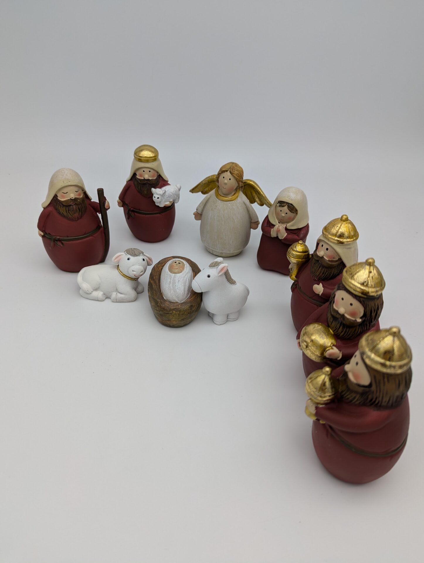 Bevat 10 kerstfiguren + een ronde houte schijf om de figuren op te zetten.